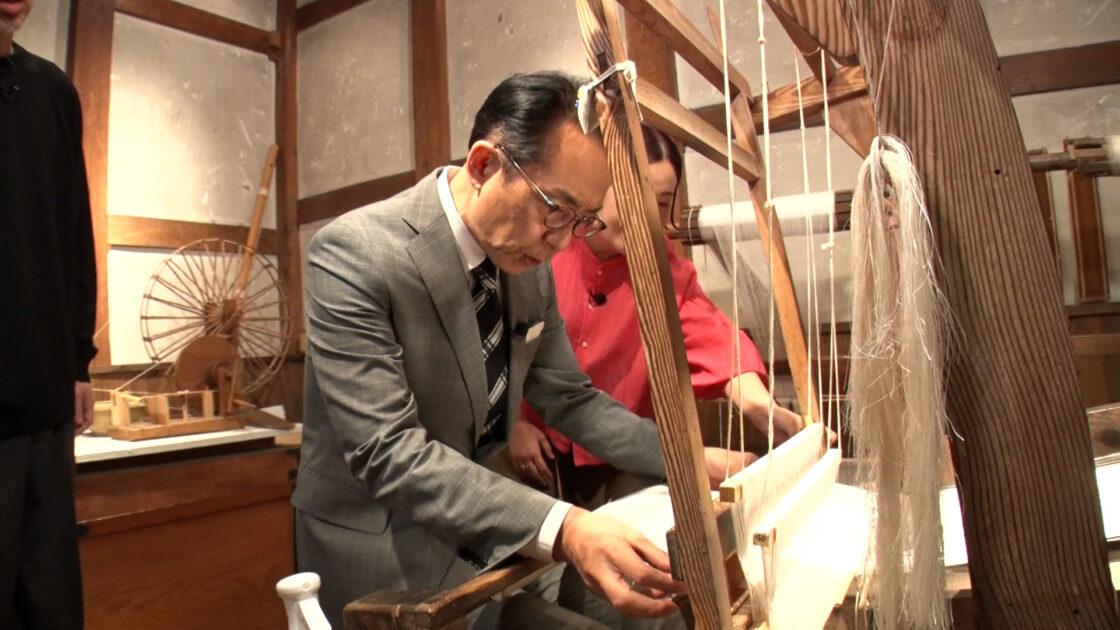 店内見学の後は、中川政七商店の原点とも言える“布蔵”へ。機織り機などの道具に実際に触れながら、手積み手織りの麻のものづくりを体験できる場所となっている。千石社長にレクチャーを受けながら、福澤が機織りに挑戦!その腕前は如何に…?