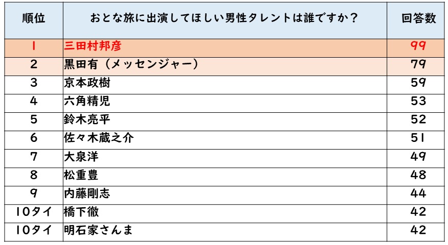 「おとな旅に出演してほしい男性タレントは誰ですか?」というアンケートでした。三田村さんとの掛け合いや日本酒談義など新しいおとな旅の魅力が生れるかも!?
