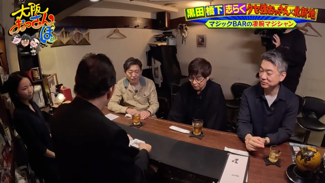 次に一行が立ち寄ったのは、北新地では老舗のマジックバー「ミストフェリーズ」。オーナーのリチャード・シブヤさんはこの道50年以上の有名マジシャンで、さっそくマジックを体験。次々と繰り出されるカードマジックに驚くおっさんたち。
