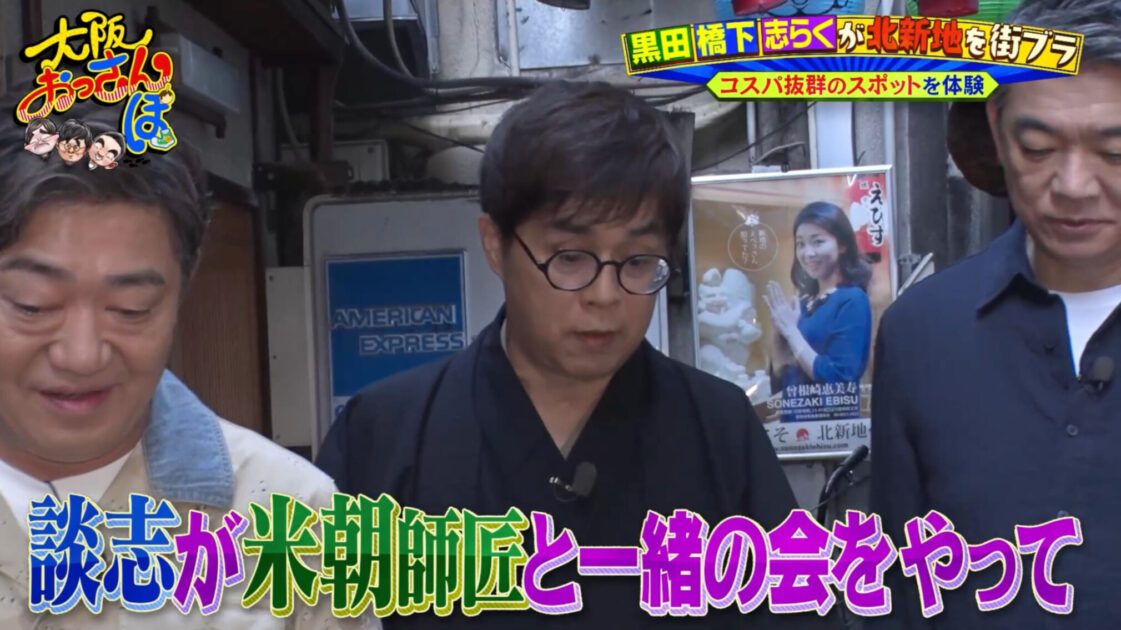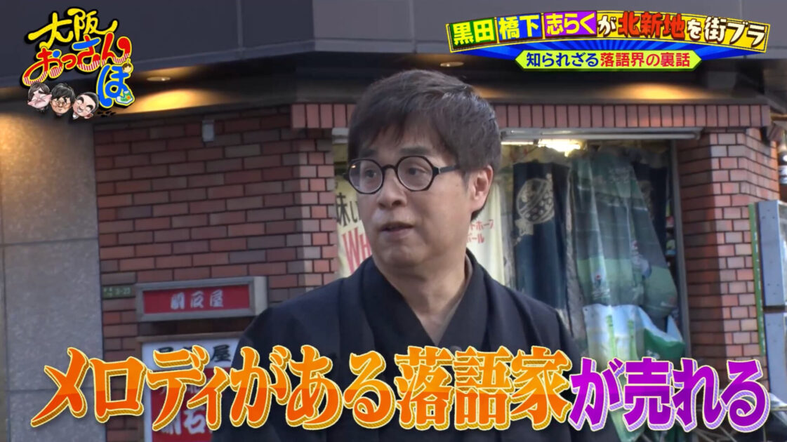 北新地をぶらり歩きながら落語トークに花を咲かせるおっさん3人。黒田は落語を「漫才と全然違う」と話す。これを受けて志らくは「(落語は)歌謡曲とか歌に近いです」と持論を展開。その理由に黒田と橋下も深く納得。