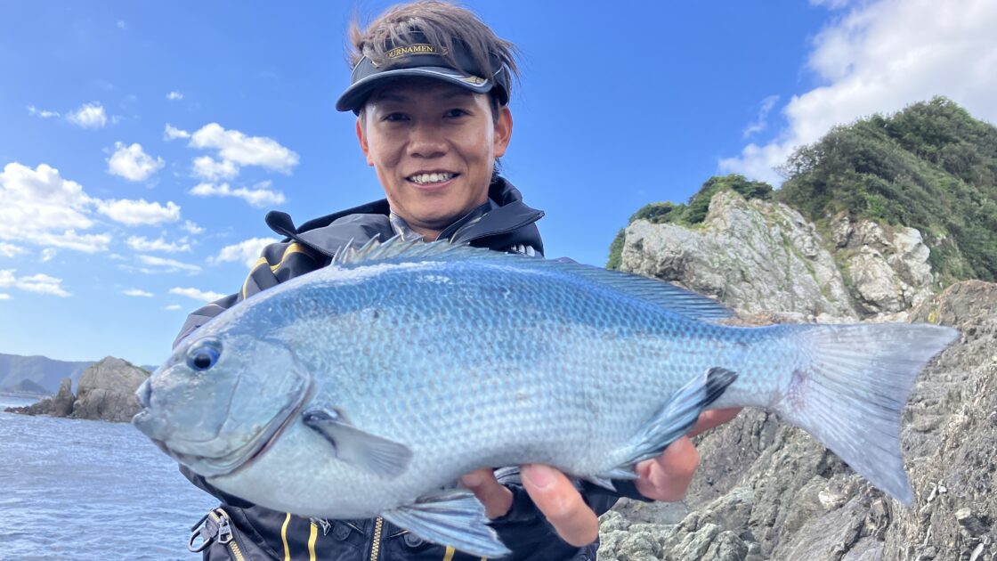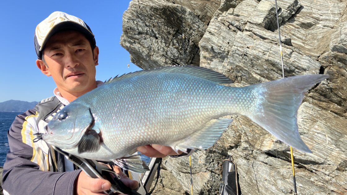 すると、すぐそばで今度は木村がヒット!こちらも力強い引きに竿が美しい弧を描く。キャッチしたのはクチブトグレ、こちらも43㎝の良型。ここから勢いに乗る2人、30㎝後半のグレを連発し、初日を終えた。