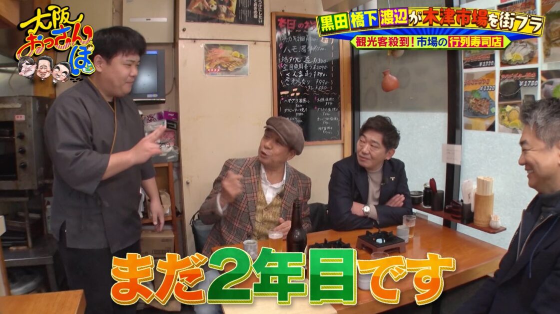 「せっかくやから生モン食べたいですね」という黒田の提案で、寿司店「まるよし」へ。注文を待つ間、話題は渡辺の娘の話に。娘が生まれた2000年からフランスの5大シャトーというワインを購入しているという、よきパパの素顔を垣間見せる。