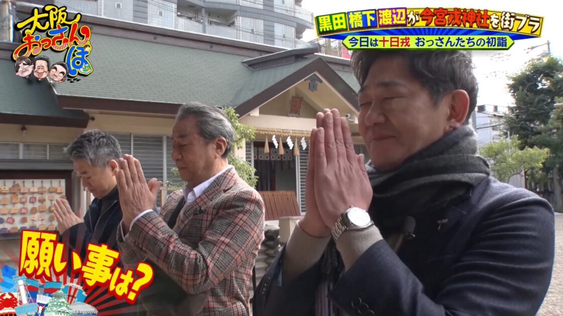 今宮戎神社の権禰宜(ごんねぎ)さんに案内されて、まずは参拝。渡辺は剣道六段の腕前だそうで「今度、七段に挑戦するので『七段に受かりますように』とお祈りしました」と明かす。