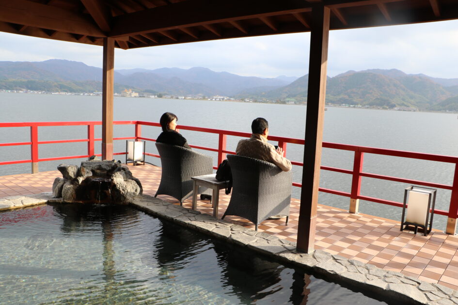 次に向かったのは、はわい温泉にある創業96年の【湯宿 望湖楼】。湯が湖の底から沸いているので、こちらのお宿の露天風呂は湖の上にあるんです!解放感抜群で、湖に浮かぶ神秘的な景色が体験できます。