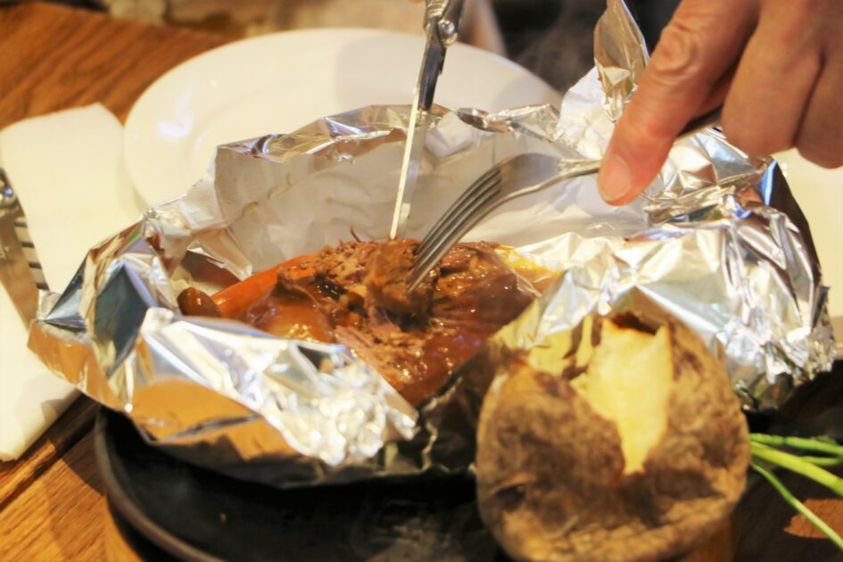 1897年創業の【キャピタル東洋亭 本店】は、京都の人なら知らない人はいない、老舗洋食店です。創業初期からの人気メニュー「百年洋食 ハンバーグステーキ」をいただきます。アルミをあけると、湯気がたちのぼり、デミグラスソースがぐつぐつぐつぐつと音を奏でます。