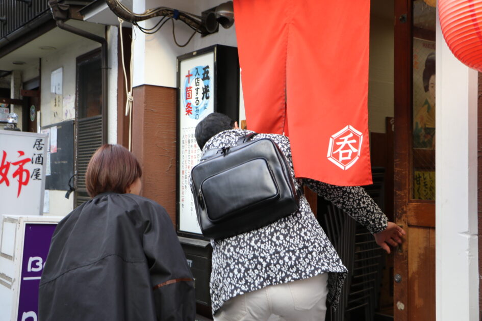 散策中、呑兵衛が心ひかれる路地を発見!「毎朝11時より開店」の看板を見つけたふたりは、さっそくお店へ。美味い酒と美味いアテをリーズナブルに楽しめる大衆酒場【路地裏stand五光】です。