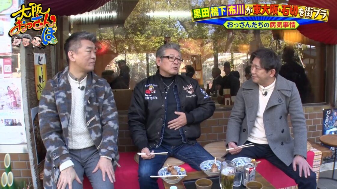 黒田と橋下は石切参道で、この日のゲスト、元シブがき隊の“ふっくん”こと布川敏和と合流。昨年還暦を迎えたという布川に、黒田は「大阪のおっさん100%の視聴率なんで、よりおっさんの布川さんを見ていただきたい」と期待を寄せる。すると布川は、ロケの4日前にぎっくり腰になったと明かし、早くもおっさん全開。