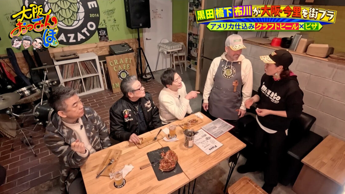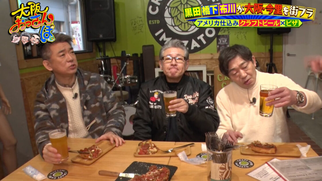 お腹が空いたおっさんたちは「クラフトカフェ今里」でひと休み。店自慢のクラフトビールとボリュームたっぷりのシカゴピザに舌鼓を打つ。痛風発症中の黒田は、特別に用意してもらったノンアルコールビールで乾杯する。