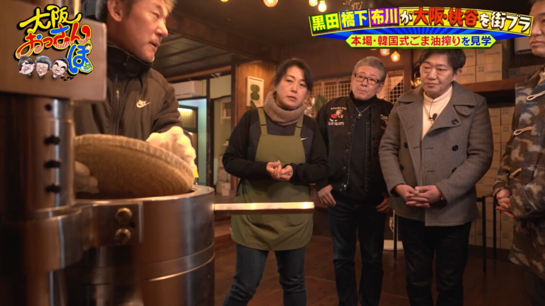 続いておっさんたちがやってきたのは「河東製油所」。ここでは韓国の伝統製法で毎日搾りたてのごま油をつくっていて、黒田は「おもしろそう!」と興味津々で見学。