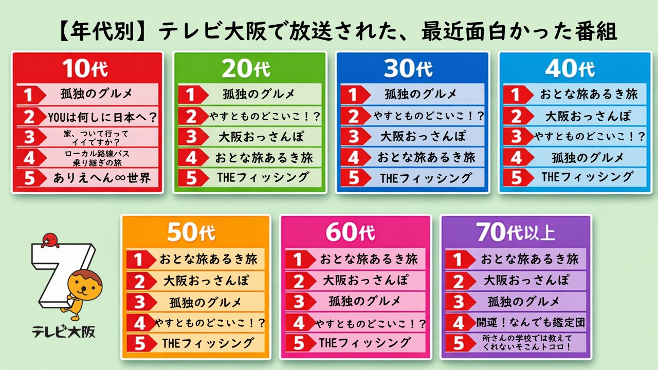 10代~30代では「孤独のグルメ」が1位を独占している一方、40代以上では「おとな旅あるき旅」が1位を獲得しました。さらに、「大阪おっさんぽ」も20代以上のすべての年代で上位にランクインする大健闘を見せています。また、50代・60代ではトップ5の順位がまったく同じという、非常に興味深い結果となりました。
