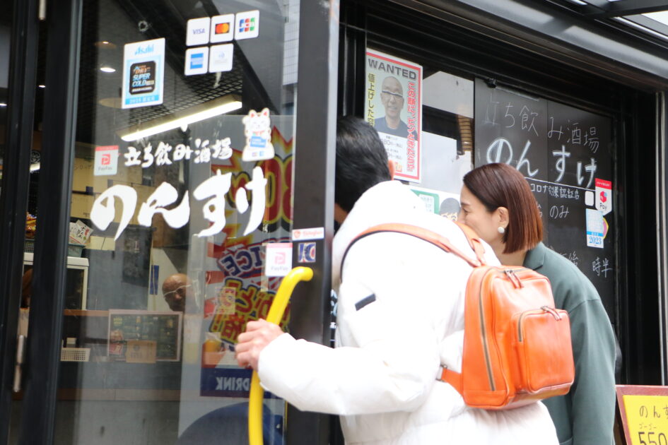 続いてやってきたのは【立ち飲み酒場 のんすけ】。『島とうがらしギョーザ』『サバ竜田揚げ』など、安くて美味しい酒のアテを堪能!国産黒毛和牛を使った人気No.1の『あごすじポン』も絶品です!