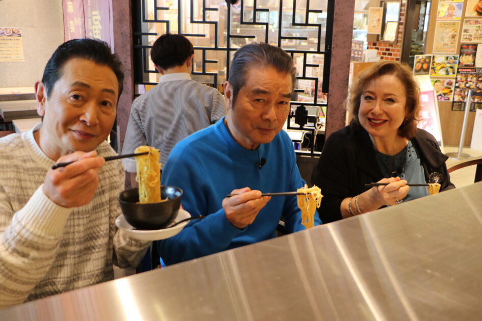 ここの4階にある【四川酒家(しせんしゅか) 福龍(ふくりゅう)】は、四川料理を日本に広めた陳建民氏の愛弟子である初代のご主人が、大阪ミナミで26年前に創業したお店の支店です。三田村は本店に何度も通っていたそうで、『紹興酒 景徳鎮壺入り8年』と『冷菜3種盛合わせ』を合わせるのがお気に入り。さらに、三田村がずっとハマっている『葱スーラー麺』もいただきます。酸っぱさと辛さのバランスが「おいしい!」と勝野夫妻も大絶賛!