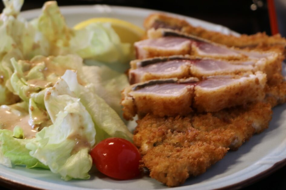 こちらは創業およそ90年、鮮魚店ならではの新鮮な魚介料理が味わえると評判の【中庭(なかにわ)商店】。『究極のアジフライ』をいただきます。4代目の店主が「お刺身とアジフライのハイブリッド」と表現する唯一無二の揚げ具合に驚くふたり。自家製たくあんタルタルもおいしく、新メニューの提案も?!
