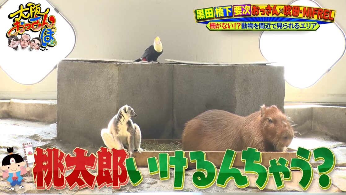 最後は動物たちが自由に遊び回るゾーンへ。ワオキツネザルやカピバラなど15種の動物たちが共生しながらのんびりくつろいでいる様子に、黒田は「ケンカせえへんの?」と目を丸くする。