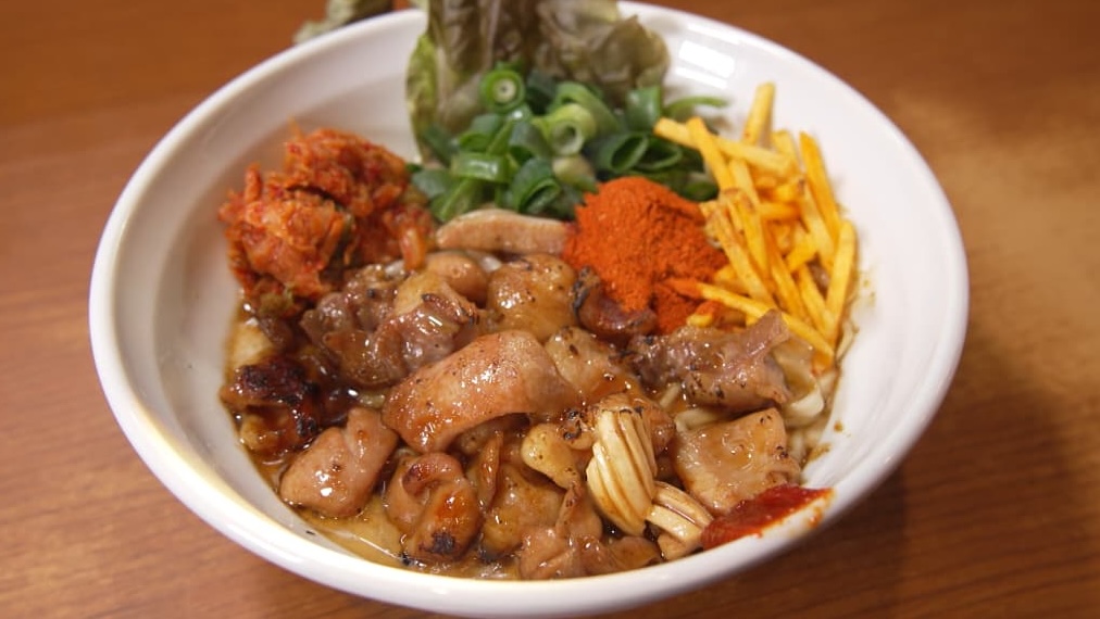 一方「だいつる」は、黒毛和牛の牛骨スープに魚介ダレを合わせた「旨辛ホルモンまぜそば」が主役。甘辛く炒めたホルモンと平打ち麺が絡む、インパクト抜群の一杯。