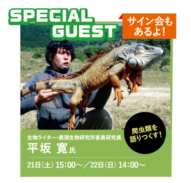 生き物専門ライターとして世界を飛び回り今やYouTubeチャンネル登録者数94.8万人を誇る平坂寛氏が両日ステージに登壇!もはやレプタイルズフィーバー恒例となった平坂氏によるトークショー、今回はどんな話が聞けるのかお楽しみに。
