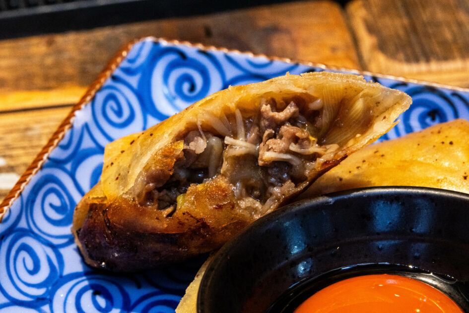 春巻きのなかには牛肉、ねぎ、しらたき、えのきが入り、味付けもすき焼きのまま。不思議な感覚が楽しめます。