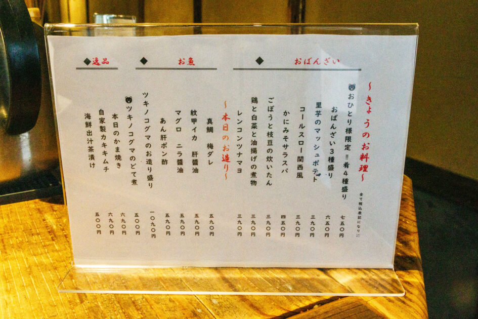 また、カウンターやテーブルには“きょうのお料理”などのおすすめのメニュー表も用意。