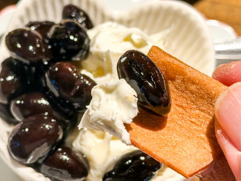 「これは不思議な合わせ方」三田村さんも表現するように、甘い黒豆と生ではない焼いた八つ橋、そこにプレーンなマスカルポーネのほどよい油脂感が加わることで他にない味わいが生まれています。